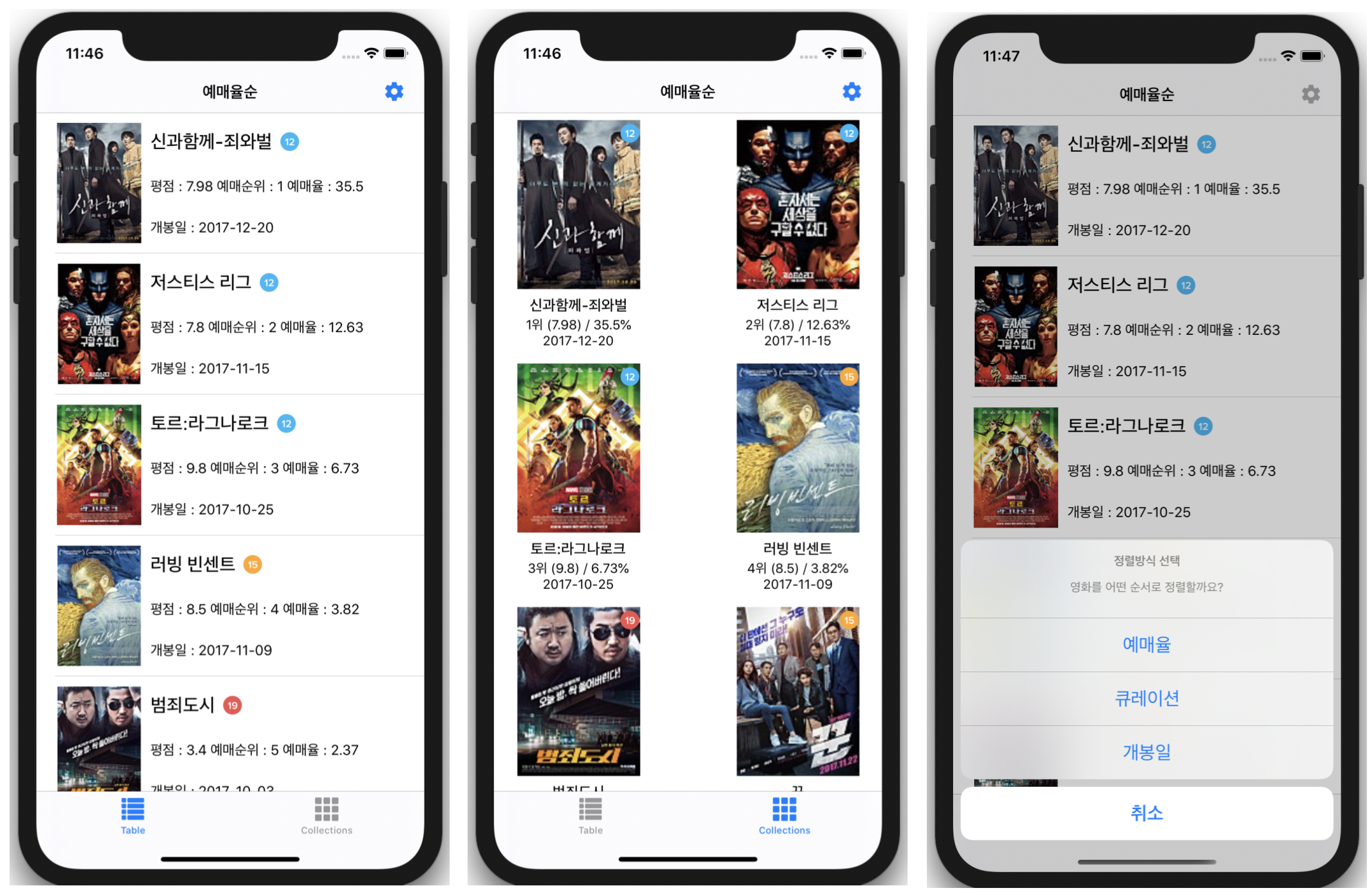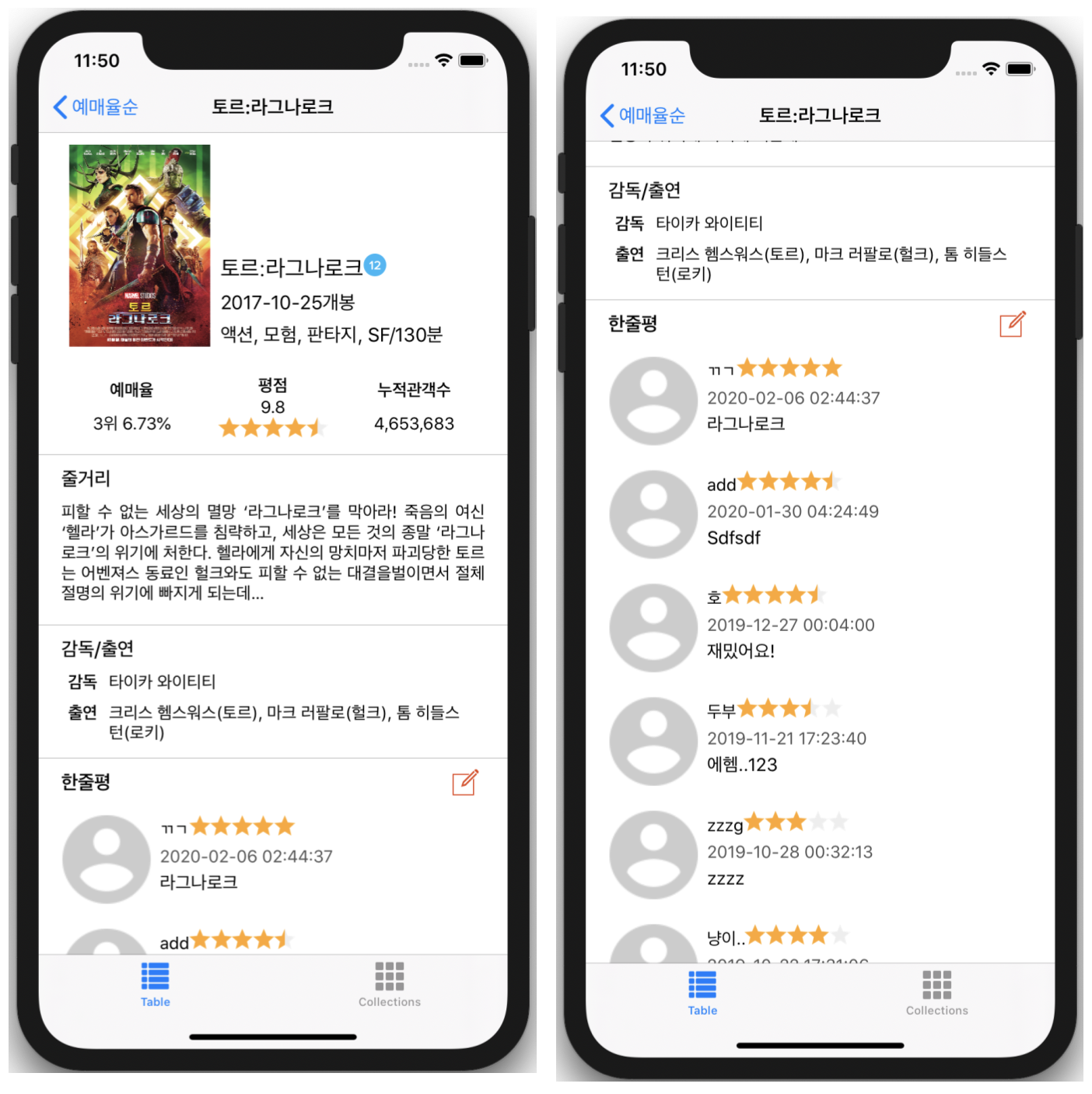 - 첫번째 탭은 테이블뷰, 두번째 탭은 컬렉션 뷰 (표시되는 내용은 같음)