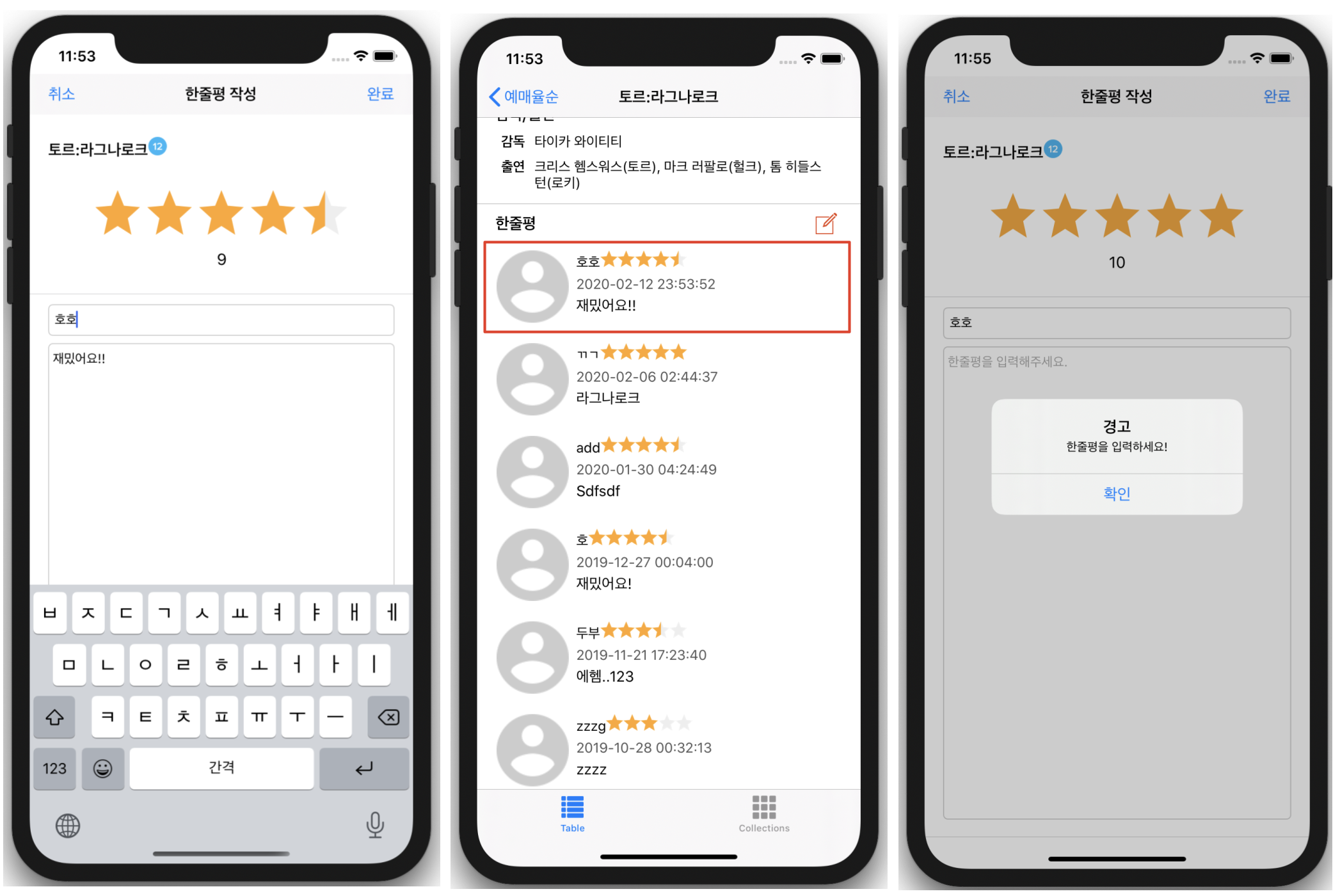 - 작성자의 닉네임과 한줄평을 작성하고 '완료' 버튼을 누르면 새로운 한줄평을 서버에 등록하고 이전화면으로 되돌아온 후, 새로운 한줄평이 목록에 업데이트 됨.