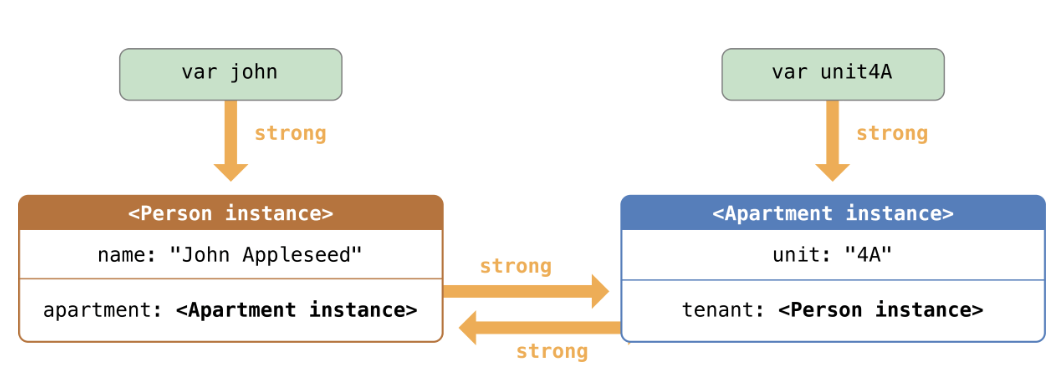 이제 Person 인스턴스는 Apartment 인스턴스에 강한 참조를 갖게 되고, Apartment 인스턴스는 Person 인스턴스에 강한 참조를 갖게 됨으로써 john과 unit4A는 strong reference cycle로 연결된다.