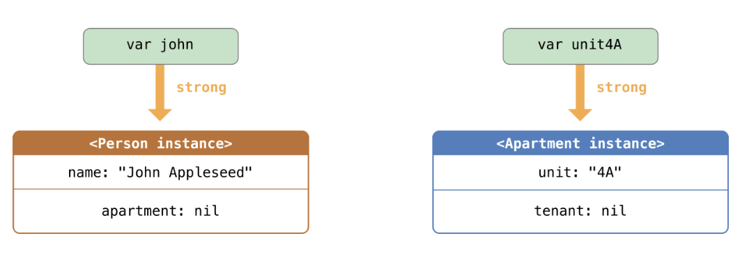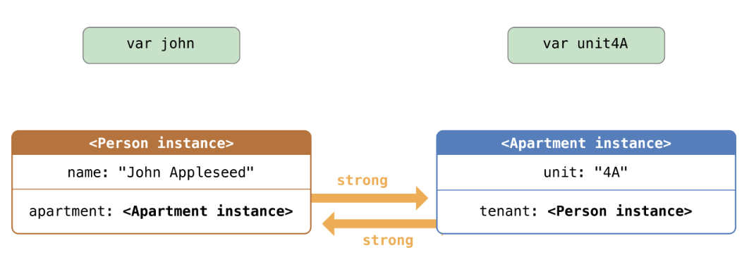 이렇게 되면 아래의 도식처럼 john 변수는 Person 인스턴스에 강한 참조를 갖고, unit4A 변수는 Apartment 인스턴스에 강한 참조를 갖게 된다.