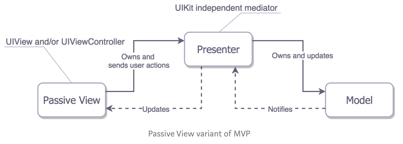 우선 MVC와 달리 UIView와 UIViewController가 Passive View에 속해있다.