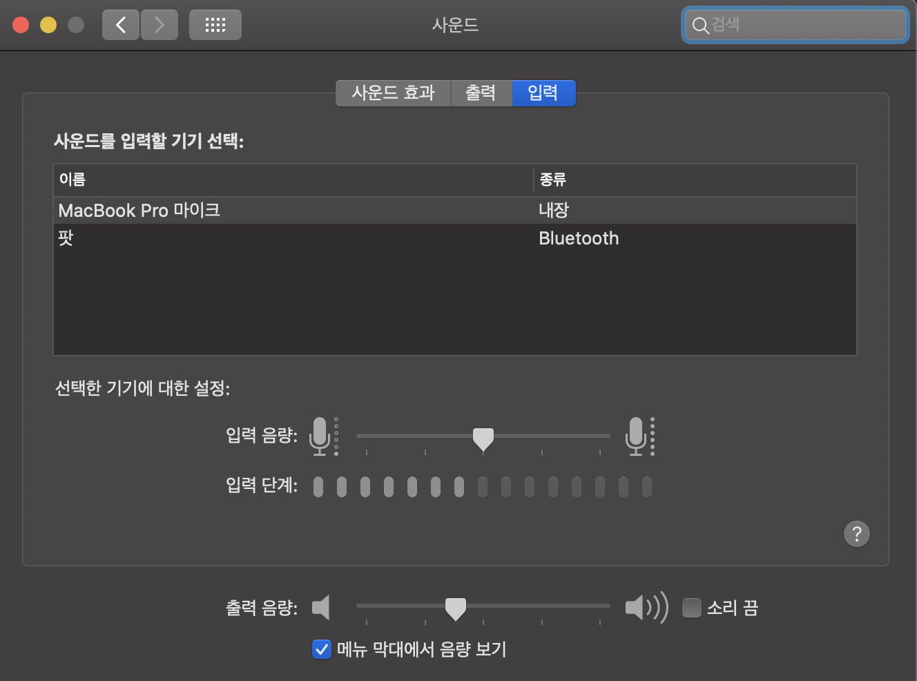이렇게 바꿔주니, 소리가 원래대로 잘나온다! 에어팟에 마이크 설정이 되어있어서, 그랬나보다.