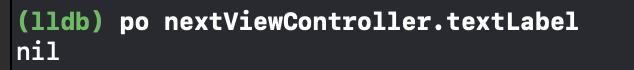 하지만, "nextViewController.textLabel 이 메모리에 있는지 보여달라!" 라고 하면, nil이 찍히는 것을 볼 수 있다.