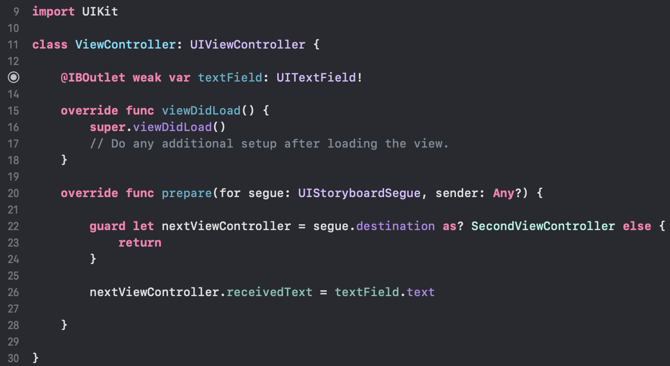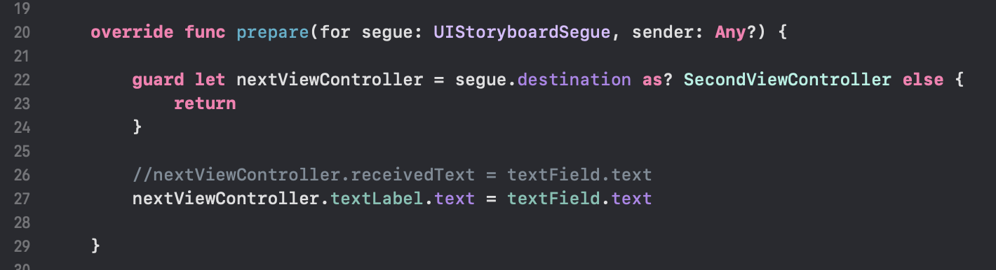 2. ViewController 코드에 textField를 Outlet으로 연결하고, prepare(for segue: sender:) 메소드에서 segue.destination 객체를 SecondViewController 타입으로 다운캐스팅을 할 수 있을 때, textField에서 입력받은 text를 SecondViewController의 receivedText로 보내준다.