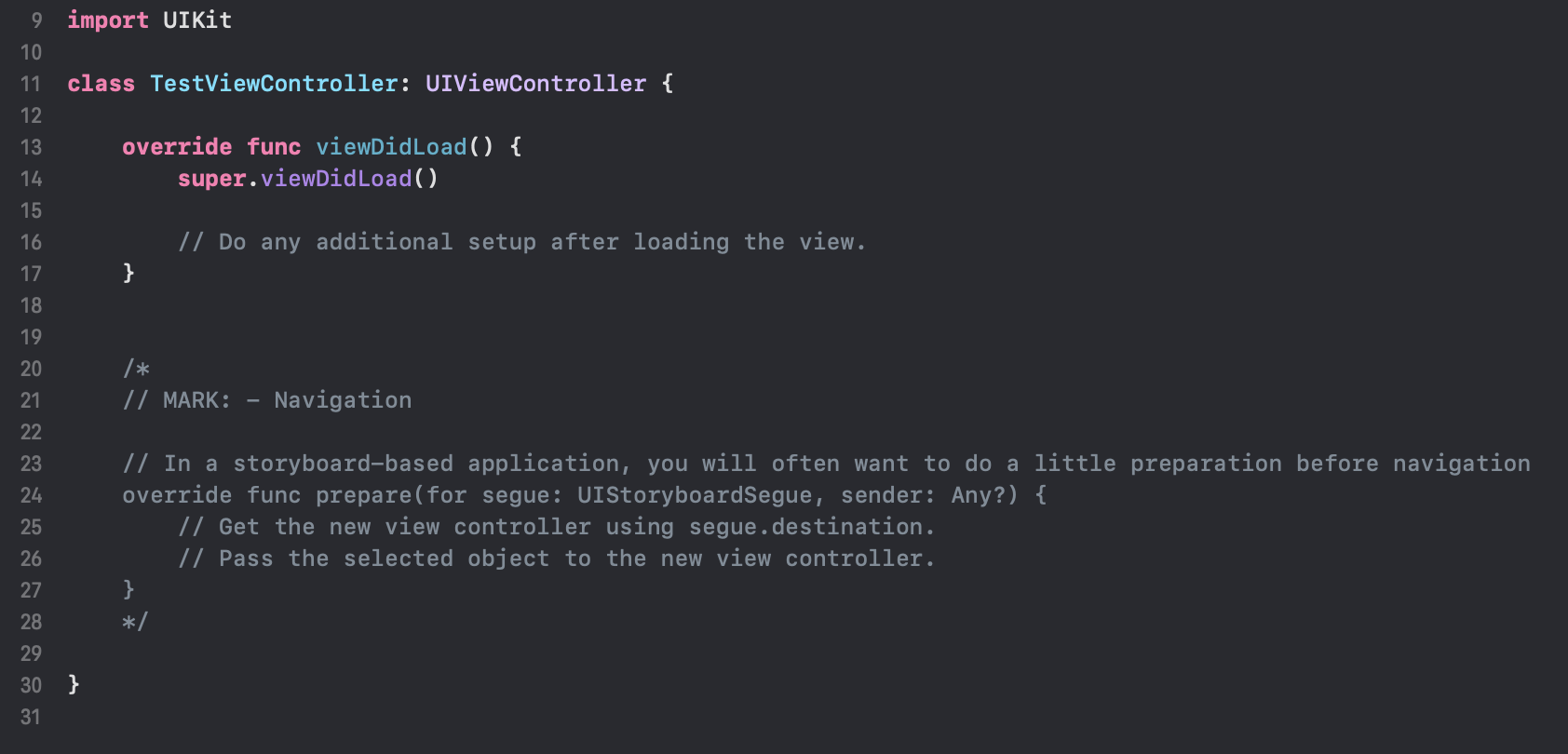 새로운 ViewController 클래스를 만들기 위해, File > New File > Cocoa Touch Class 를 생성하게 되면, 아래 첨부한 코드처럼 기본적으로 viewDidLoad() 메소드가 정의되어있고, prepare(for segue: sender:) 메소드가 주석처리 되어있다.