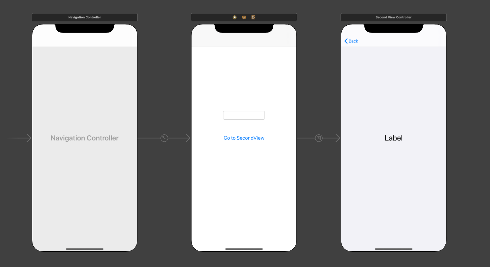 1. ViewController에는 text를 입력받을 TextField와 누르면 SecondViewController로 이동하는 Button을 추가한 후, SecondViewController로 Segue를 연결했다. SecondViewController에는 ViewController로 부터 받은 text 데이터를 보여줄 Label을 추가했다. 또한, ViewController를 Navigation Controller로 Embed 했다.