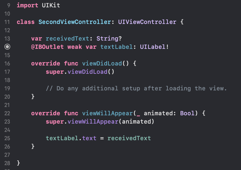 SecondViewController에 receivedText라는 변수를 따로 선언하지 않고, 아래 코드처럼 바로 textLabel.text에 넣어주는게 더 간단하지 않을까???